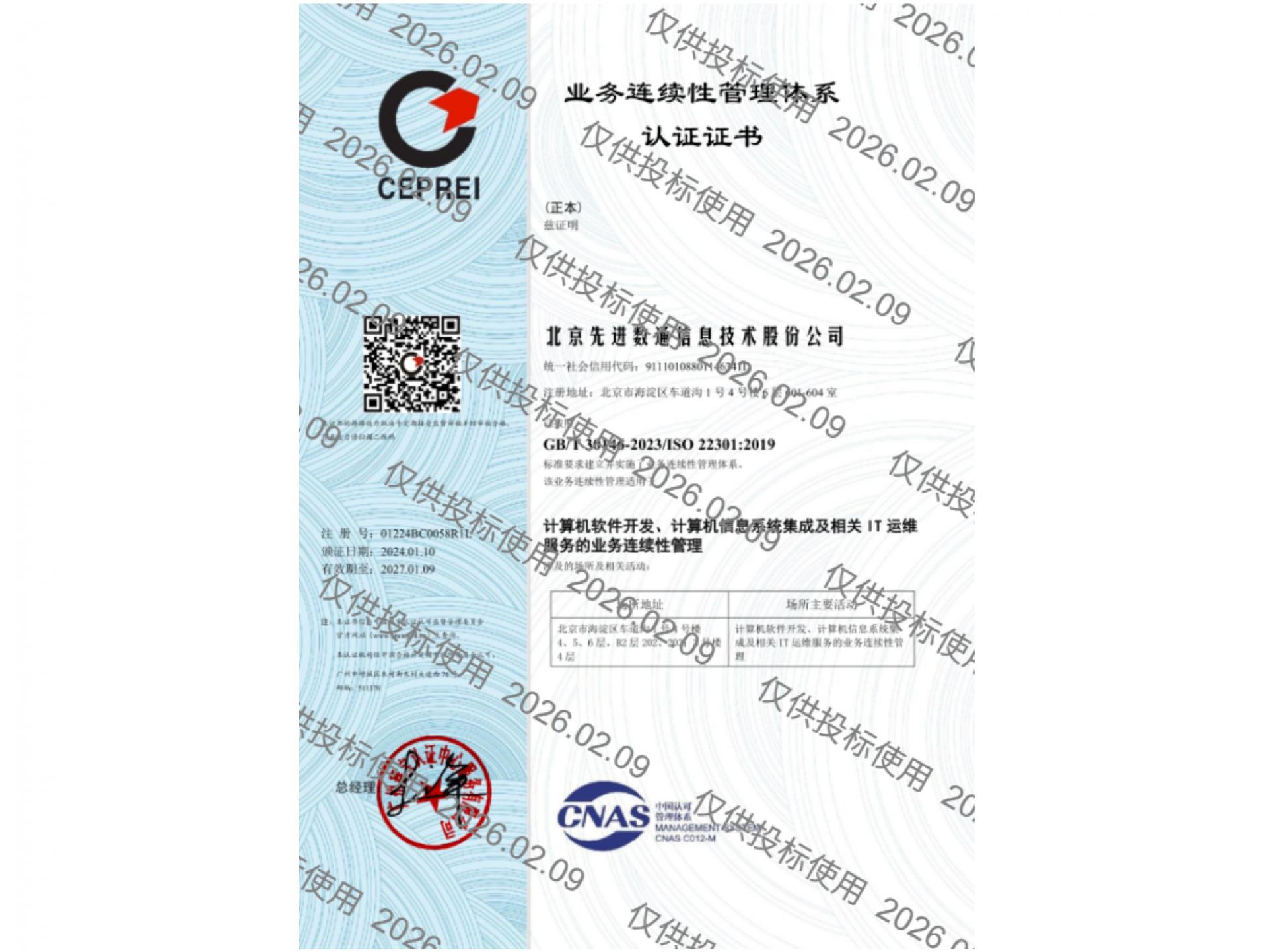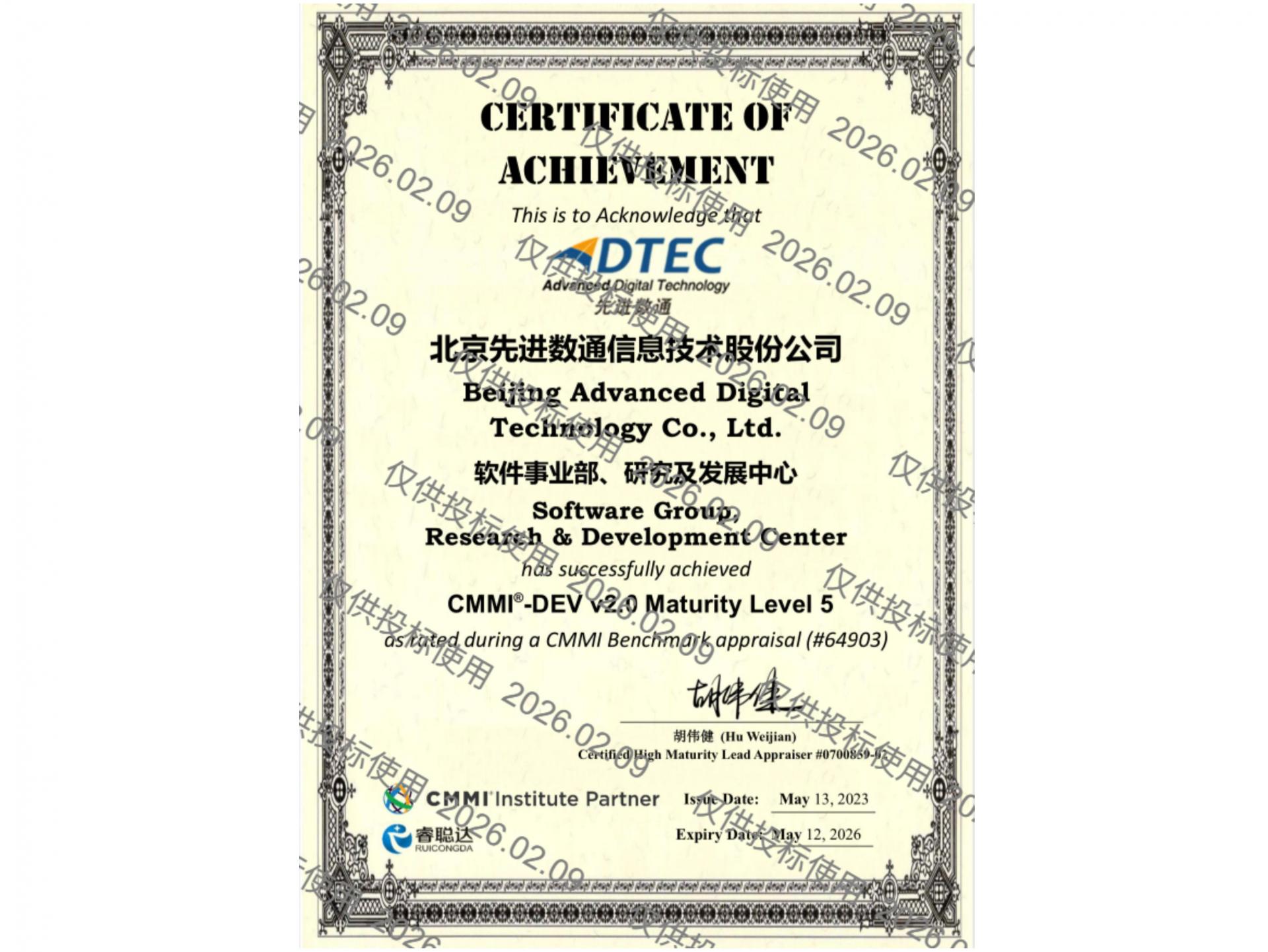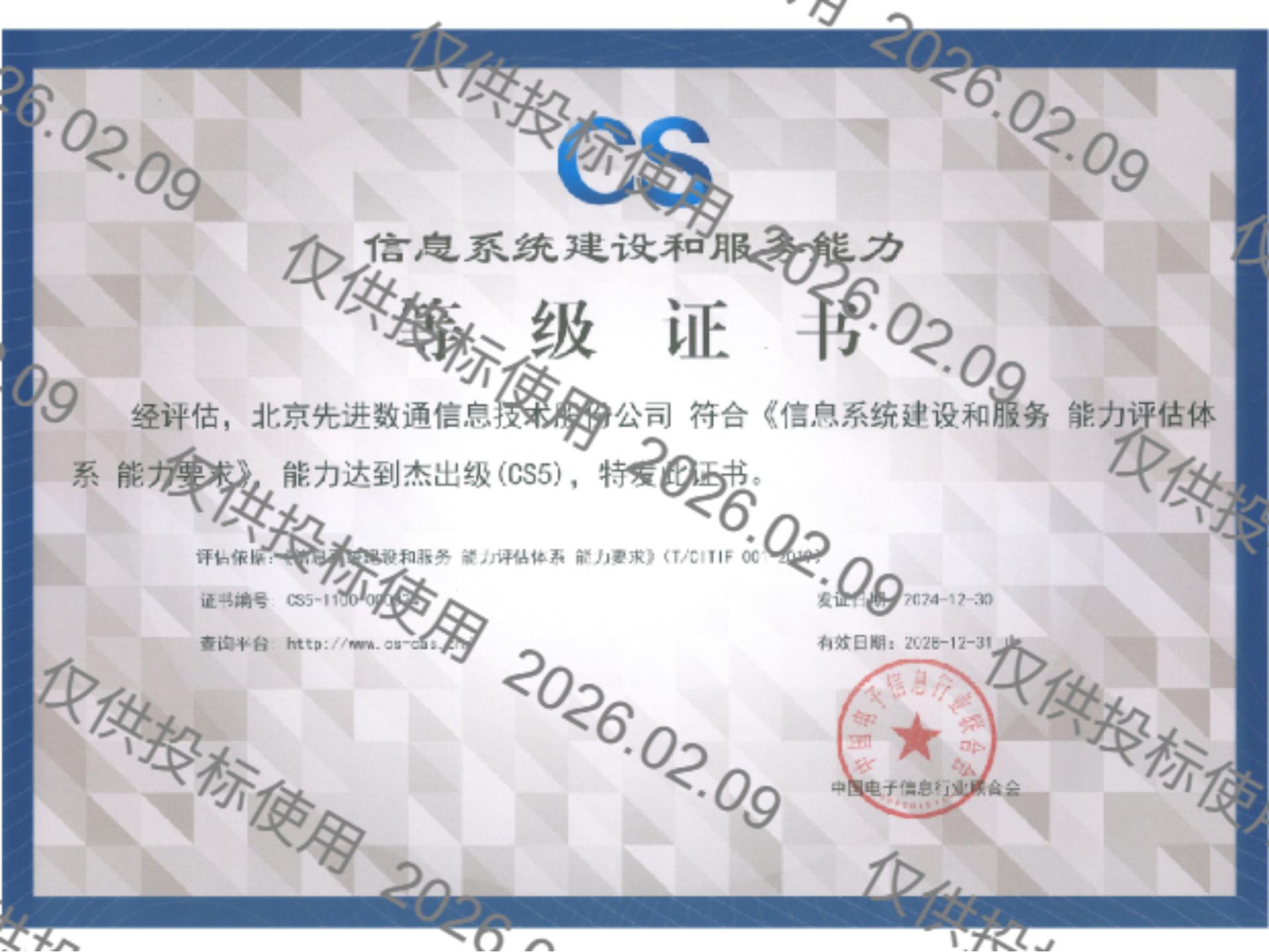 先进918搏天堂先后获得CMMIL5、软件能力成熟度五级(SPCA 5)、信息系统建设和服务能力评估系统(CS)5级、ITSS成熟度一级、信息系统安全集成服务资质二级、信息系统安全运维服务资质二级、国产化信息系统集成和服务能力评估四级(LS4)、北京市企业技术中心等资质认证,,,,,,,并获得ISO9001、ISO20000、ISO27001、ISO14001、ISO45001、ISO22301、ISO37001、ISO28001、GBT29490等尺度系统认证,,,,,,,具备行业当先的技术开发、工程执行及服务保险能力。。。。。。。