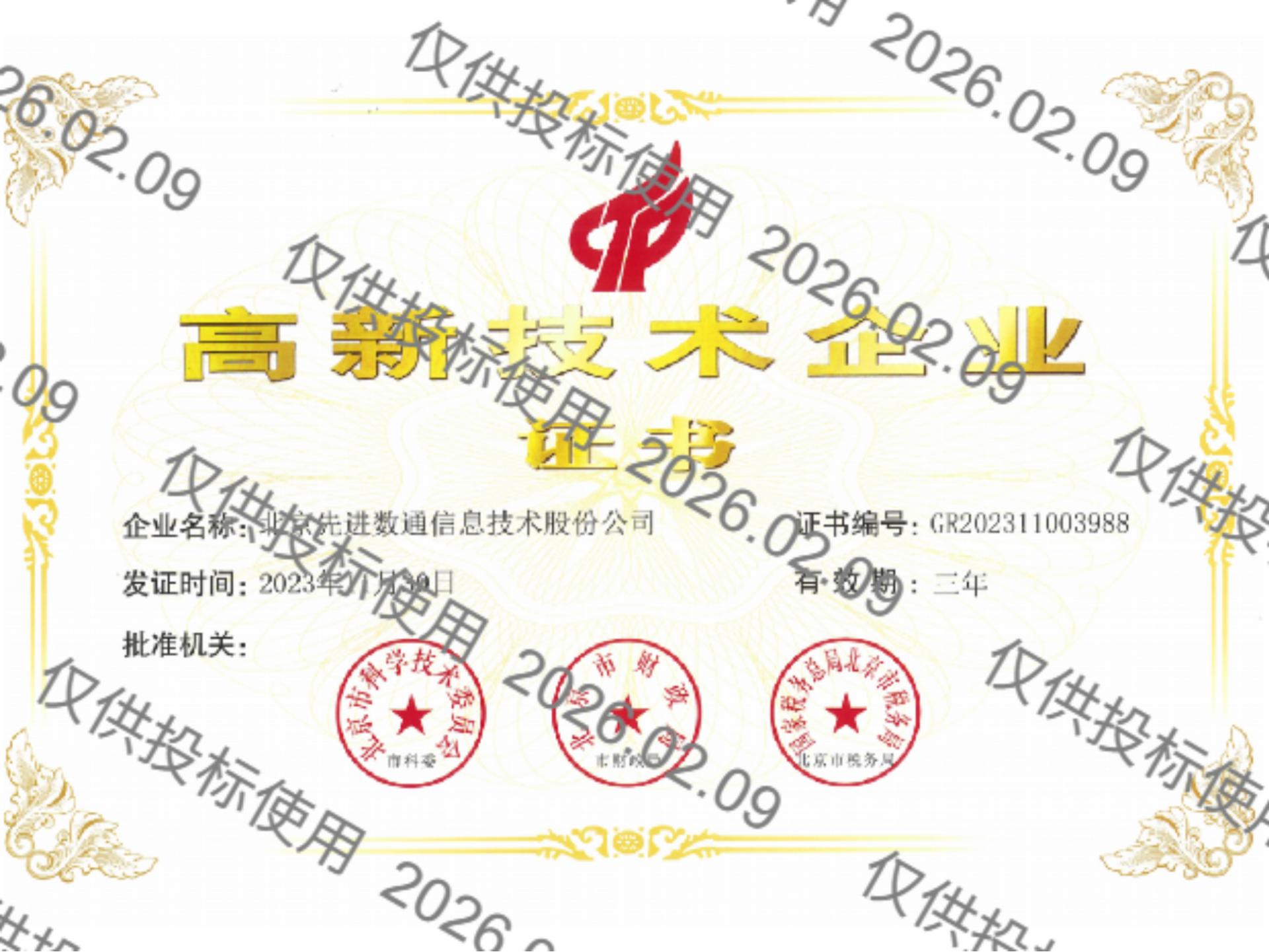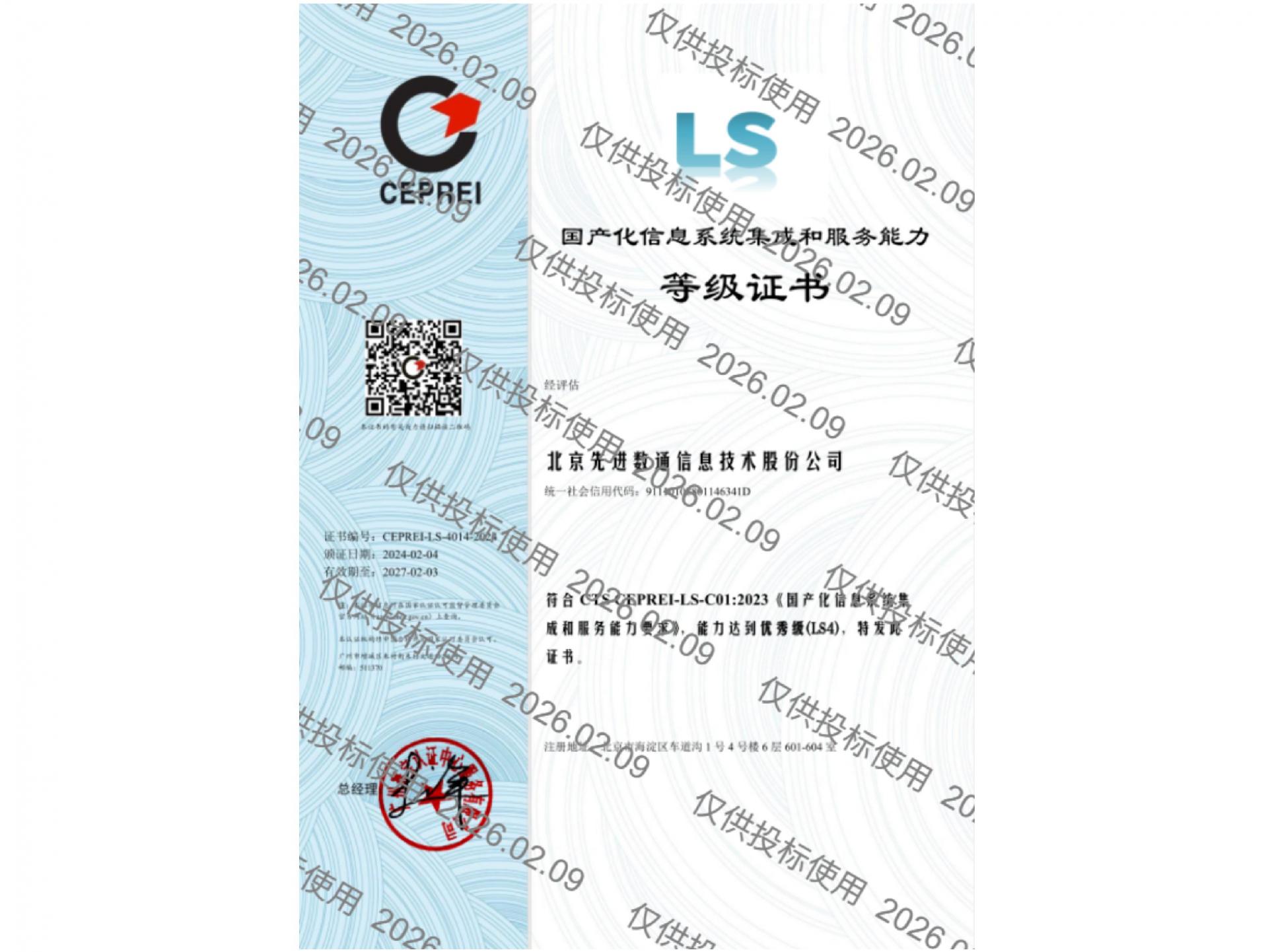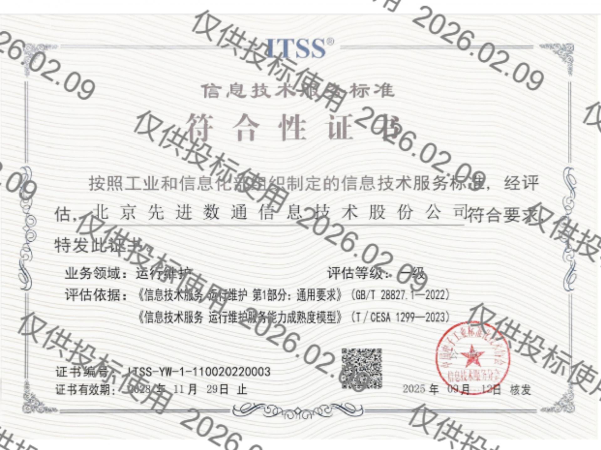 先进918搏天堂先后获得CMMIL5、软件能力成熟度五级(SPCA 5)、信息系统建设和服务能力评估系统(CS)5级、ITSS成熟度一级、信息系统安全集成服务资质二级、信息系统安全运维服务资质二级、国产化信息系统集成和服务能力评估四级(LS4)、北京市企业技术中心等资质认证,,,,,,,并获得ISO9001、ISO20000、ISO27001、ISO14001、ISO45001、ISO22301、ISO37001、ISO28001、GBT29490等尺度系统认证,,,,,,,具备行业当先的技术开发、工程执行及服务保险能力。。。。。。。
