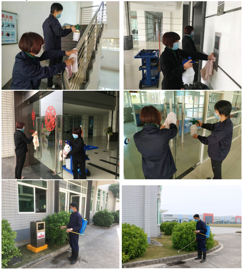 For the public areas of the factory area, the lobby, stairs, elevators and other places where people are in contact, all of them are disinfected with sanitary and efficient disinfection water, and key areas are repeatedly disinfected.