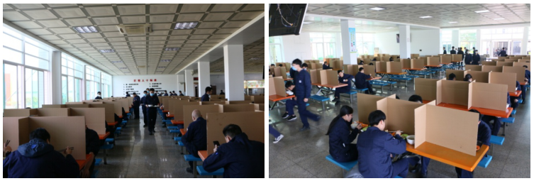 In order to ensure the safety of employees' meals during the epidemic prevention period, the emergency management team and various business units coordinated, and the employees' meals were staggered. At the same time, the Liaison Office organized the dining room to set up a dining seat partition to prevent employees from talking, and to prevent the spread of droplets.